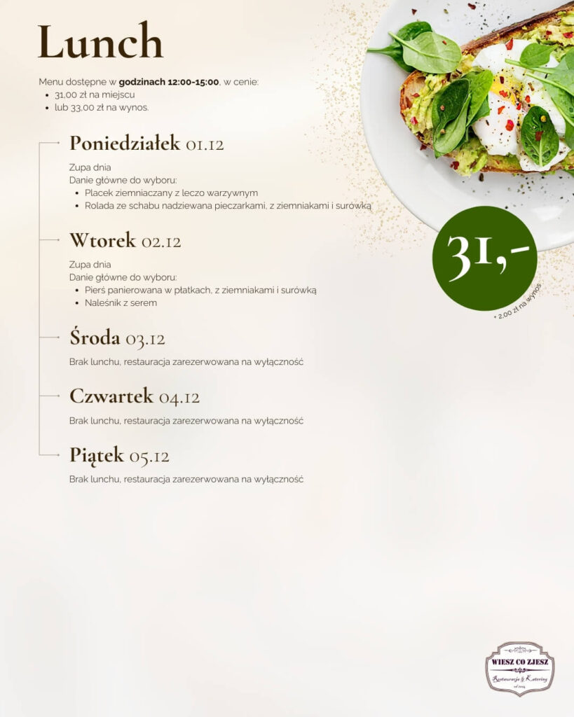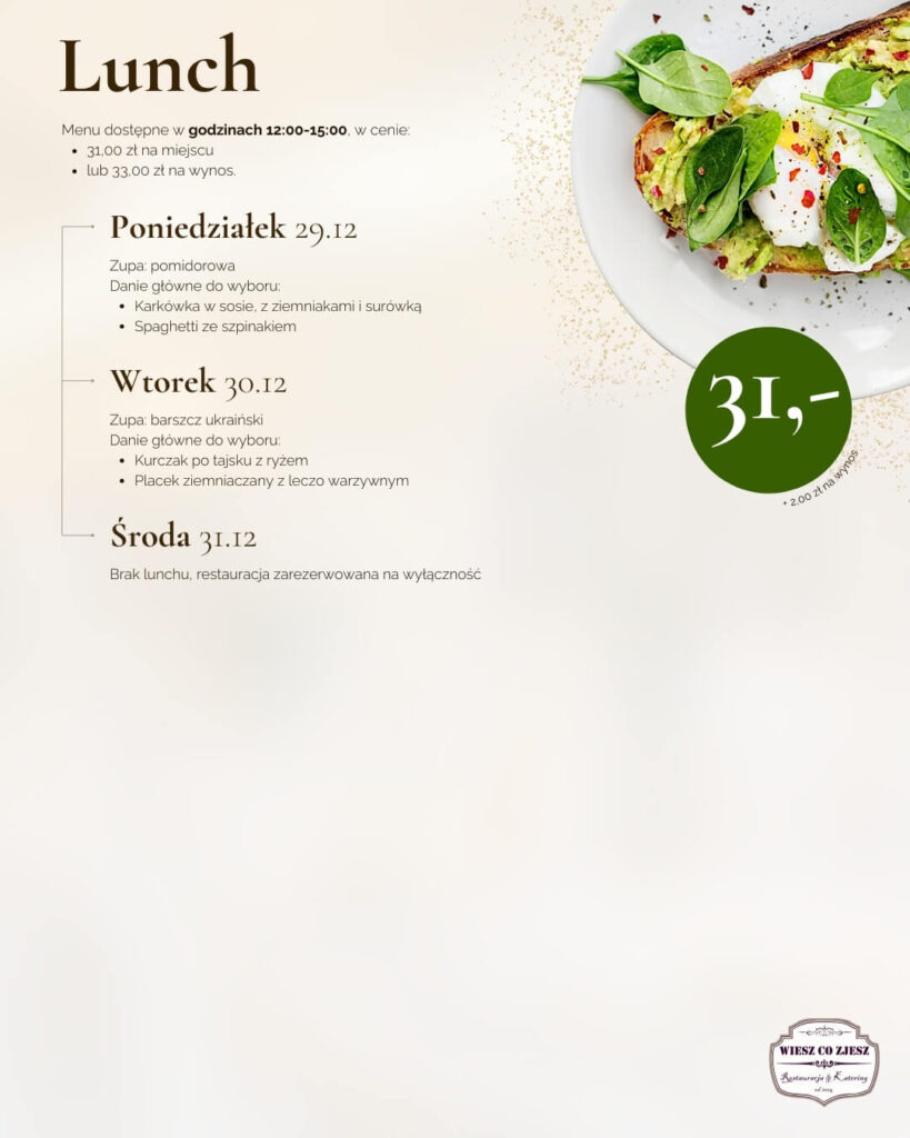 Lunch możesz zjeść zarówno na miejscu w restauracji, jak również zamówić na wynos za dopłatą 2,00 zł.